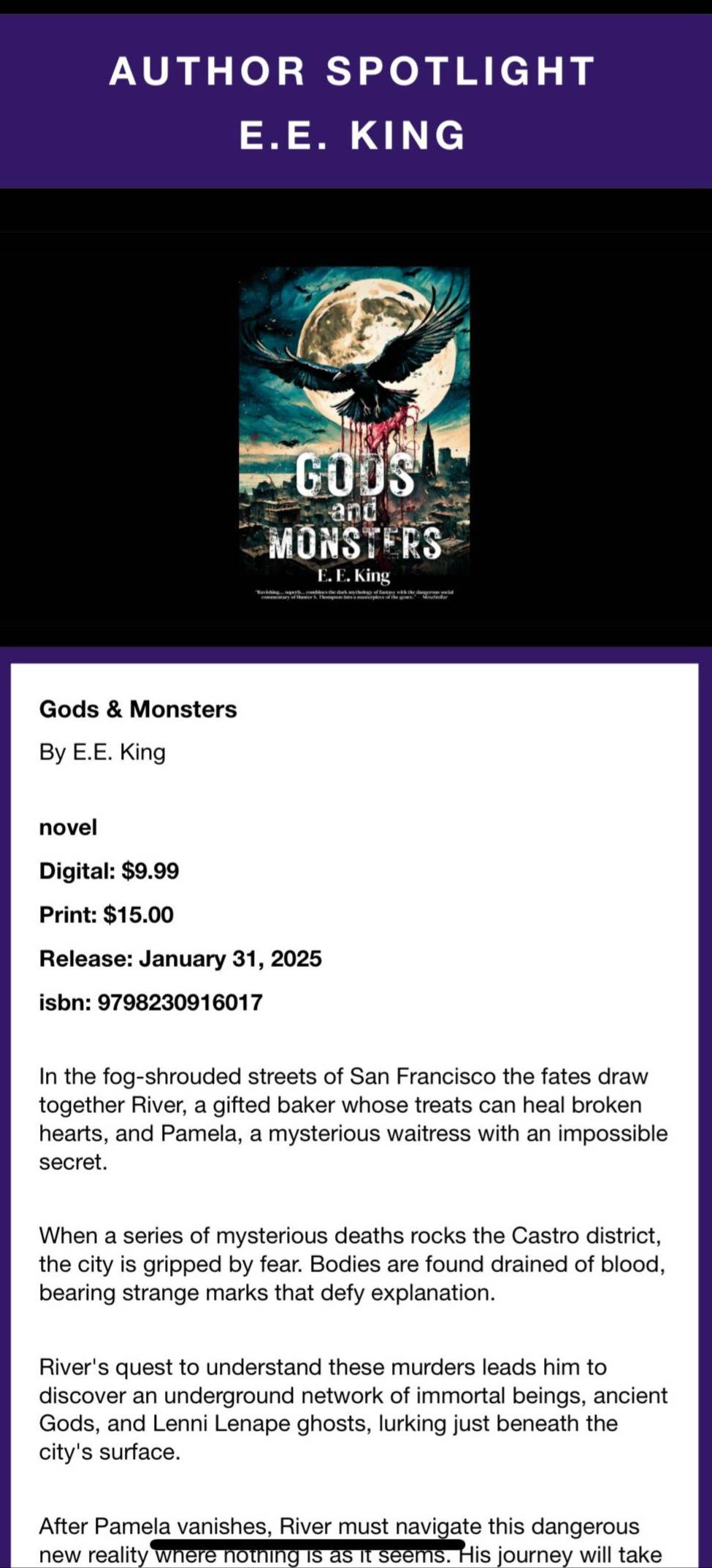 Weaving together Greek mythology, San Francisco history, and supernatural romance, “Gods and Monsters” is a haunting tale of eternal love, devastating choices, and the price of immortality.