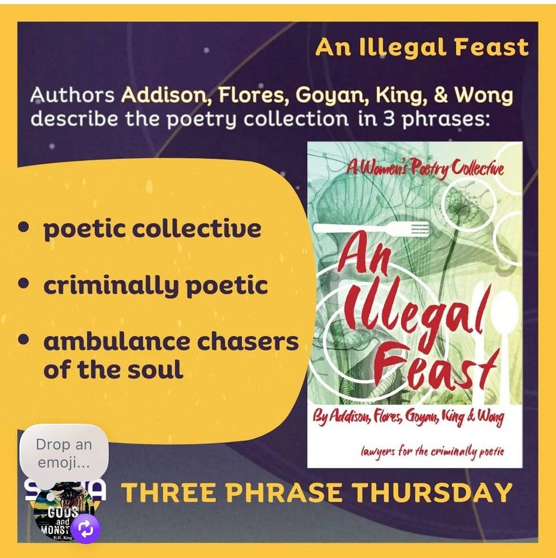 YOU CAN BUY OUR FIRST BOOK, AN ILLEGAL FEAST, here. And we all wish you would.